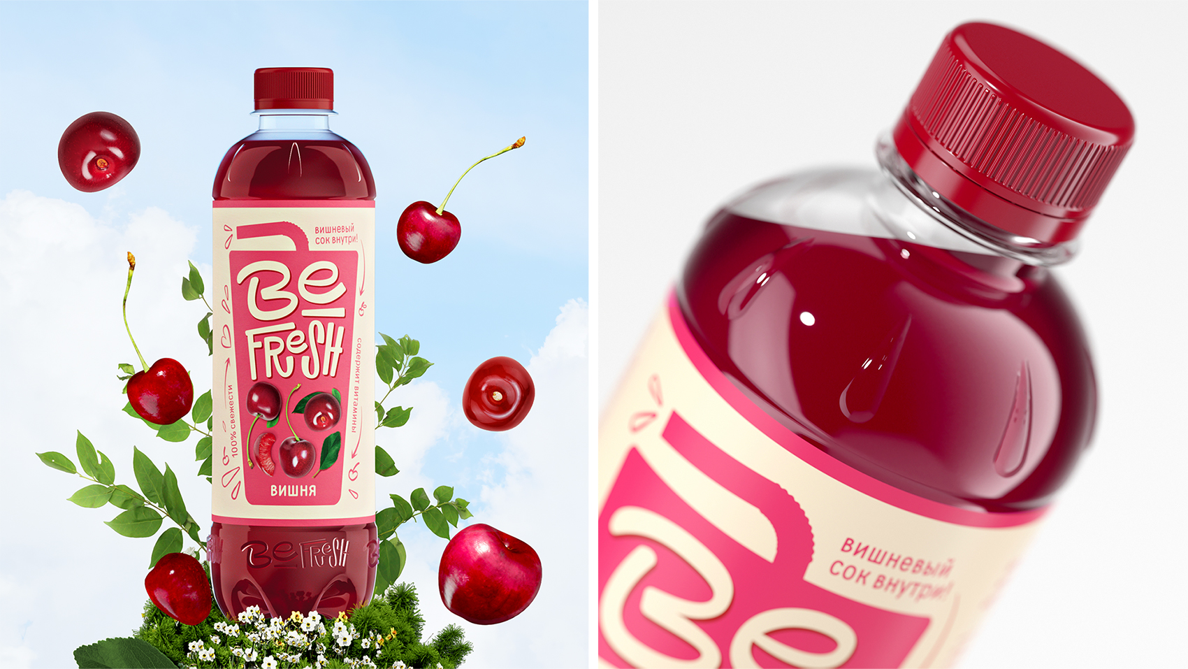 BeFresh is a new beverage brand that emphasizes natural ingredients: high fruit juice content, vitamins, and vibrant flavor. The packaging design is simple yet striking, instantly catching the eye while conveying freshness and lightness.